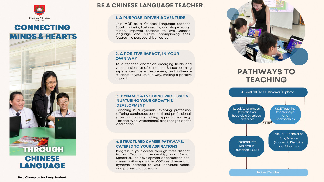 If you are passionate about nurturing a love for the Chinese Language and would like to enable our students to learn to as high a level and for as long as possible, MOE welcomes you to join us in this purposeful and fulfilling career as a teacher!