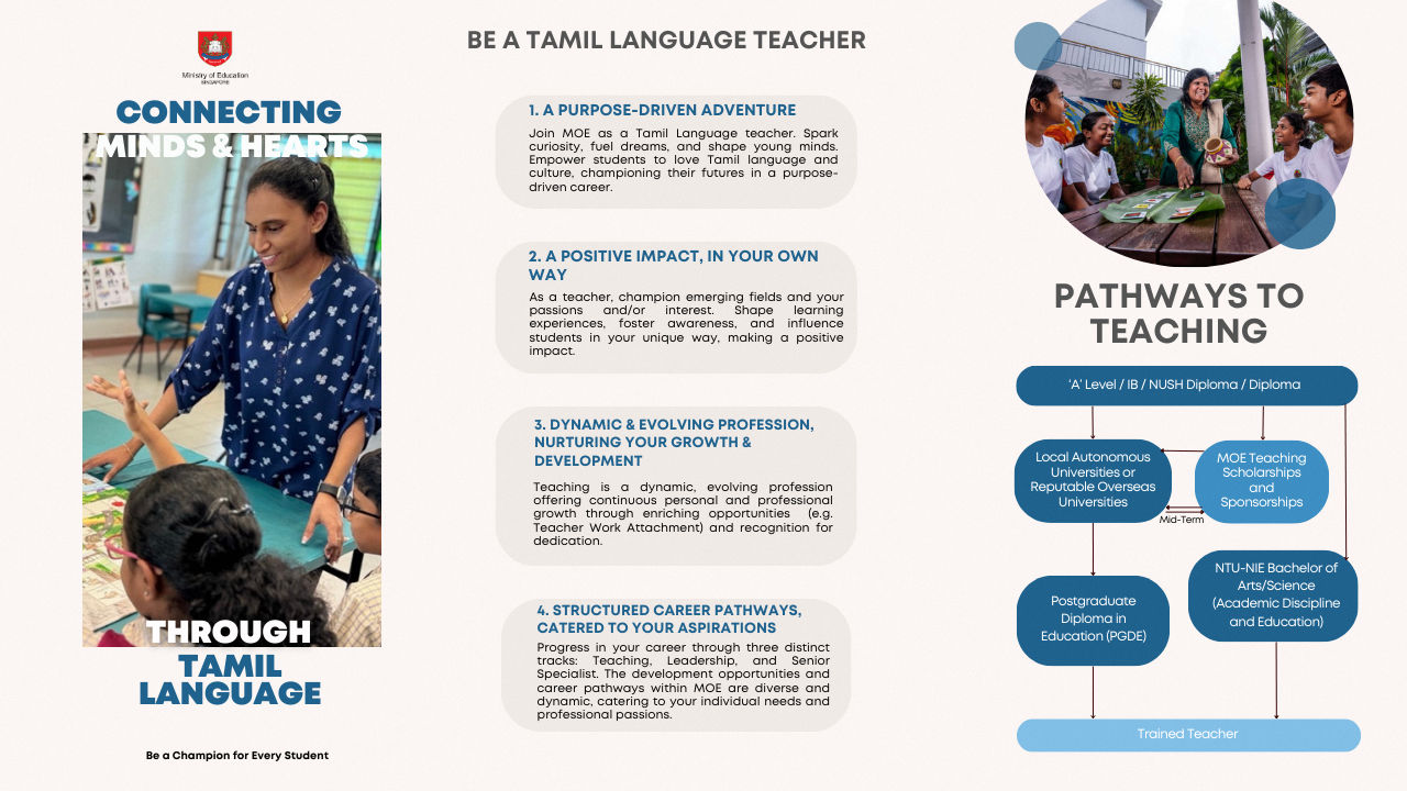 If you are passionate about nurturing a love for the Tamil Language and would like to enable our students to learn to as high a level and for as long as possible, MOE welcomes you to join us in this purposeful and fulfilling career as a teacher!