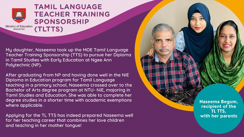 Are you passionate about Tamil Language (TL)? Do you want to inspire the next generation of young minds? If so, take up the Tamil Language Teacher Training Sponsorship (TLTTS) with MOE.