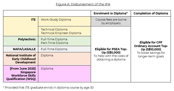 The IPA will benefit all Singaporean ITE graduates aged 30 and below who pursue a diploma qualification issued by an MOE-funded institution from 2024, or a diploma qualification awarded under the Singapore Workforce Skills Qualification (WSQ) from 1 June 2025.