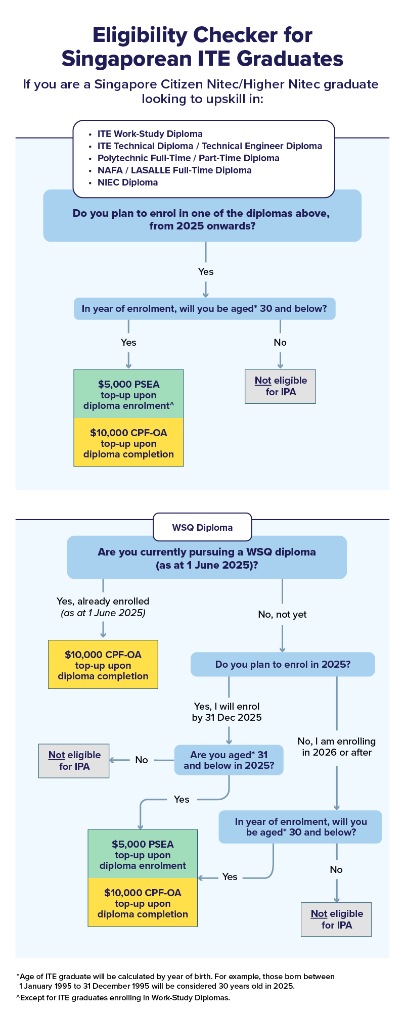 - Singaporean ITE graduates aged 31 in 2025 (born between 1 January 1994 and 31 December 1994) who enrol in a diploma awarded under the Singapore Workforce Skills Qualification (WSQ) from 1 June 2025 to 31 December 2025 in 2025, will be awarded the IPA.