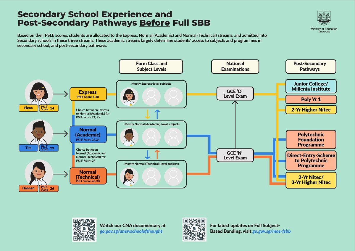 Starting from the 2024 Secondary 1 cohort, the Normal (Technical), Normal (Academic) and Express streams will be removed. Under Full Subject-Based Banding (Full SBB), students will be posted to secondary schools through Posting Groups 1, 2 and 3 instead, and have greater flexibility to offer subjects at different subject levels as they progress through secondary school.