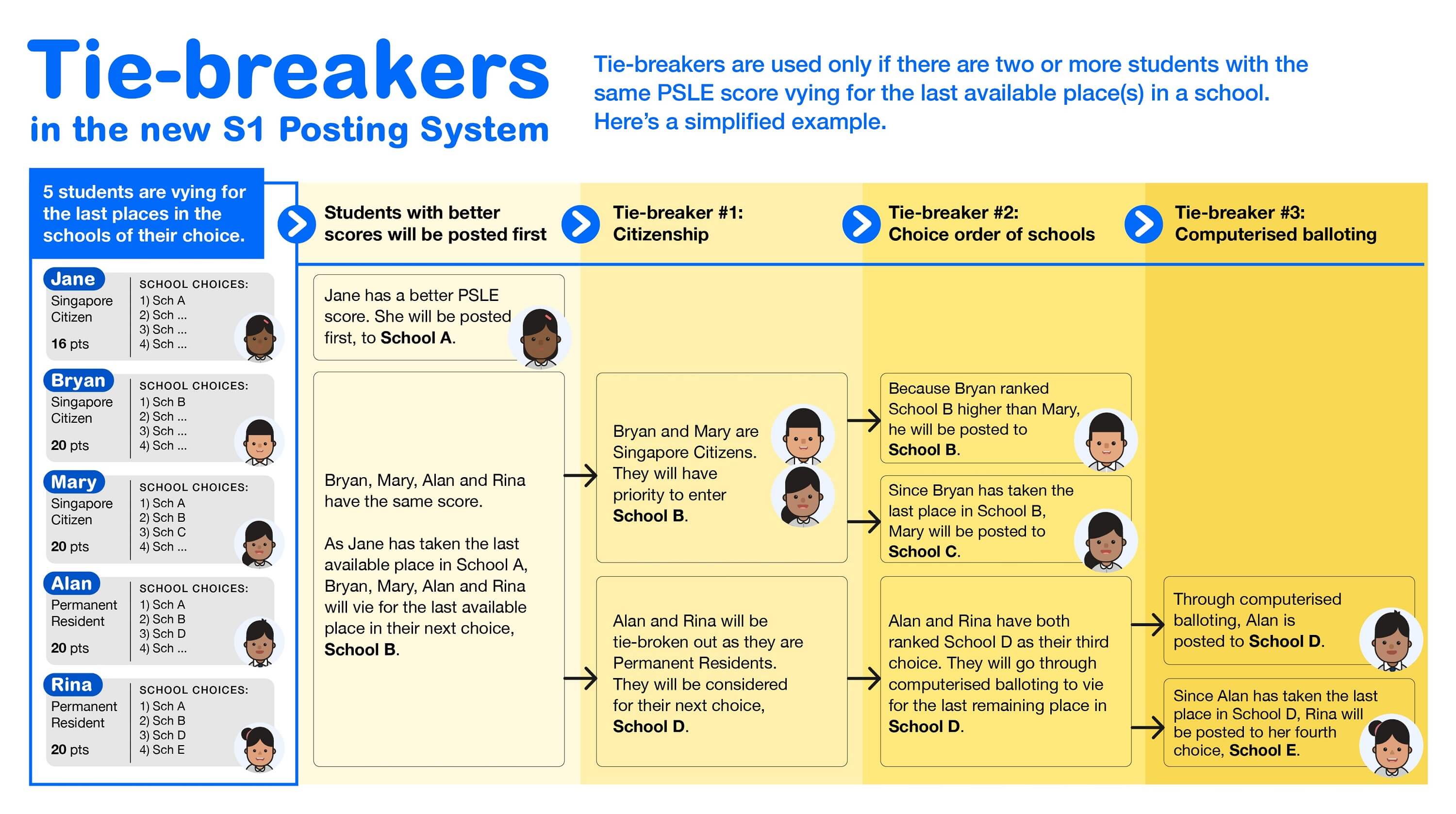 Tie-breakers are used only if there are two or more students with the same PSLE Score vying for the last available place(s) in a school.