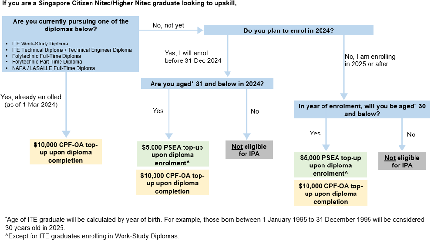 - The IPA will benefit all Singaporean ITE graduates aged 30 and below1 who pursue a diploma qualification issued by MOE-funded institutions from 2024. The IPA will automatically be credited into graduates' Post-Secondary Education Account (PSEA) or CPF Ordinary Account (CPF-OA) upon meeting the respective milestone of diploma enrolment or diploma completion (see Figure A):