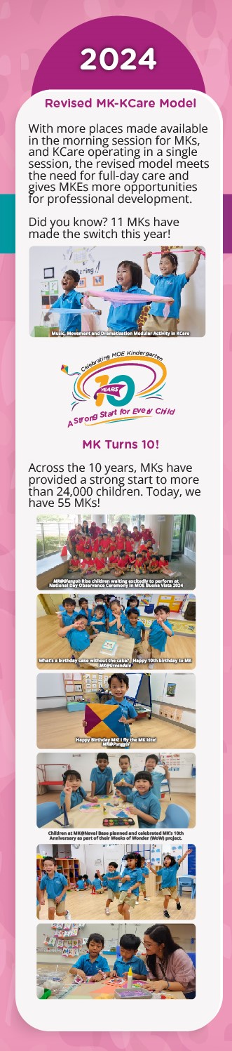 MOE Kindergarten (MK) celebrates a decade of nurturing young minds, developing children holistically and laying a strong foundation for future learning. Travel with us down memory lane to learn more about MK through the years and how we celebrated MK’s 10th Anniversary in schools and as a fraternity.
