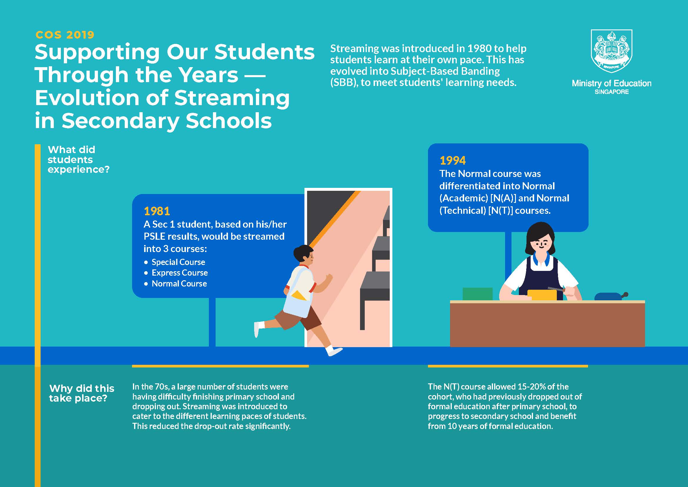 In the 1970s, many students had difficulty finishing primary school and were dropping out. Streaming was introduced to cater to the different learning paces of students. This reduced the drop-out rate significantly.