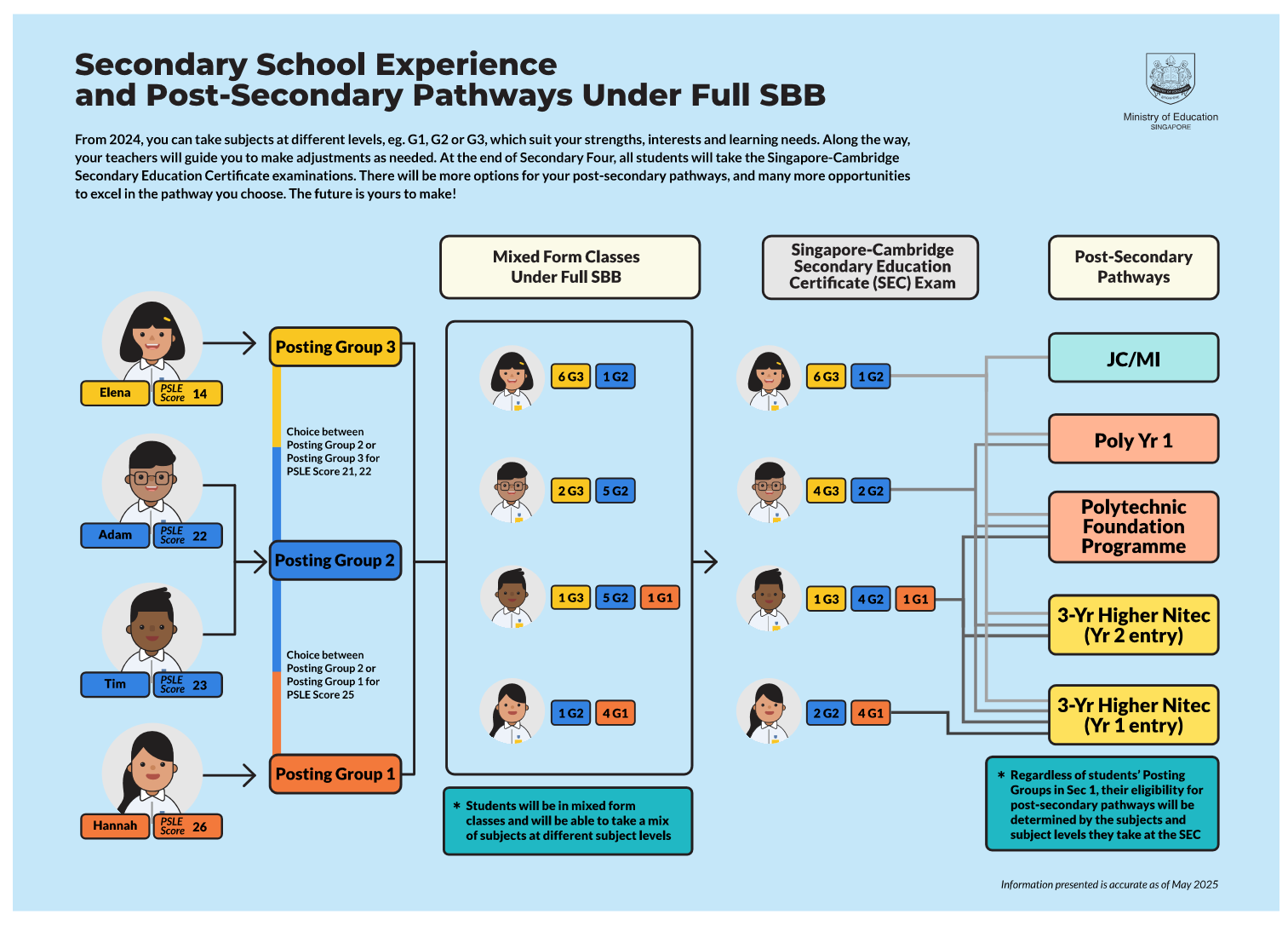 Starting from the 2024 Secondary 1 cohort, the Normal (Technical), Normal (Academic) and Express streams will be removed. Under Full Subject-Based Banding (Full SBB), students will be posted to secondary schools through Posting Groups 1, 2 and 3 instead, and have greater flexibility to offer subjects at different subject levels as they progress through secondary school.